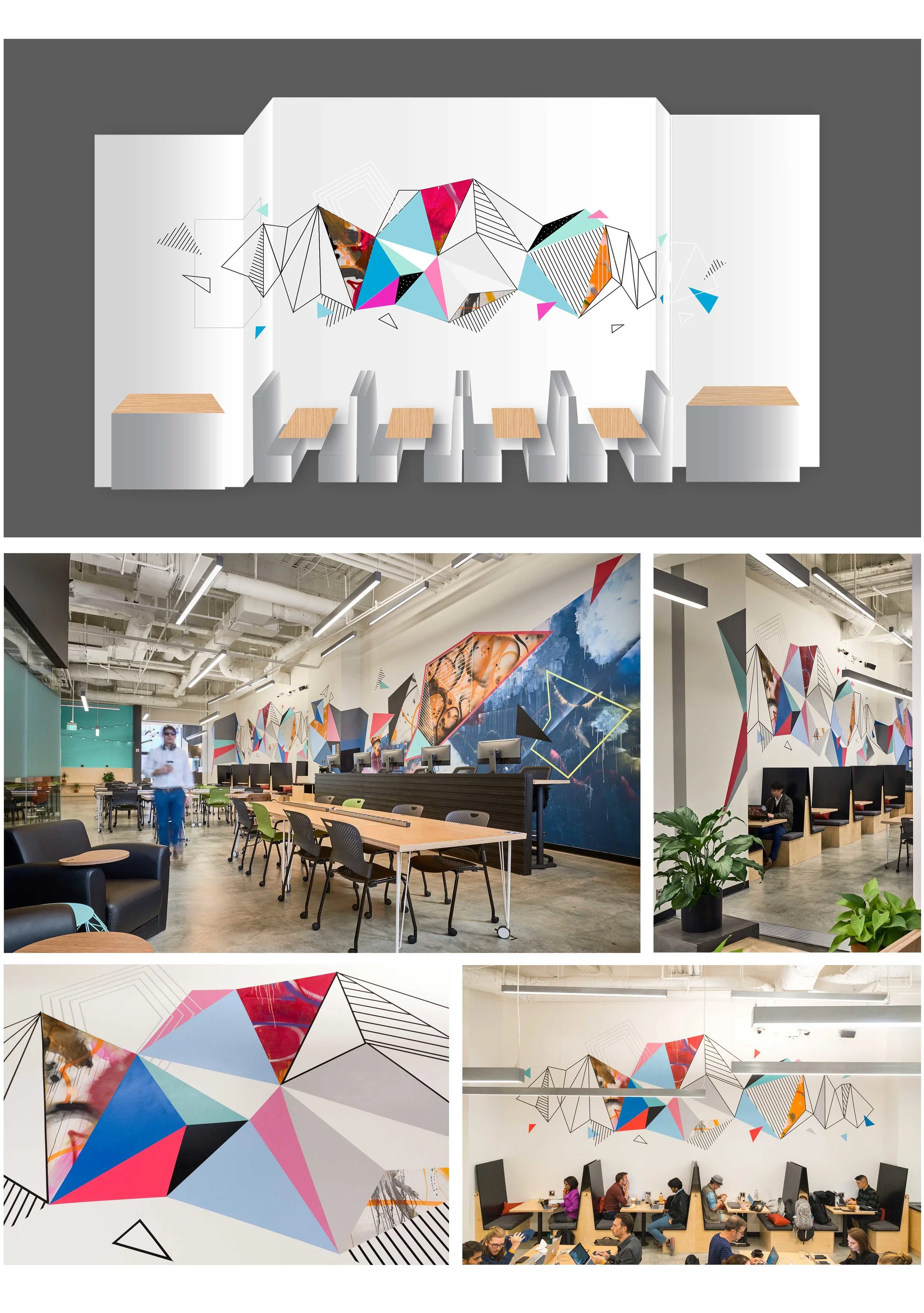 Concept: An artistic interpretation of brand elements. Constructed with triangles and clean lines the mural is an abstract representation depicting a balance between structure/precision with creative freedom through collaborative energy.