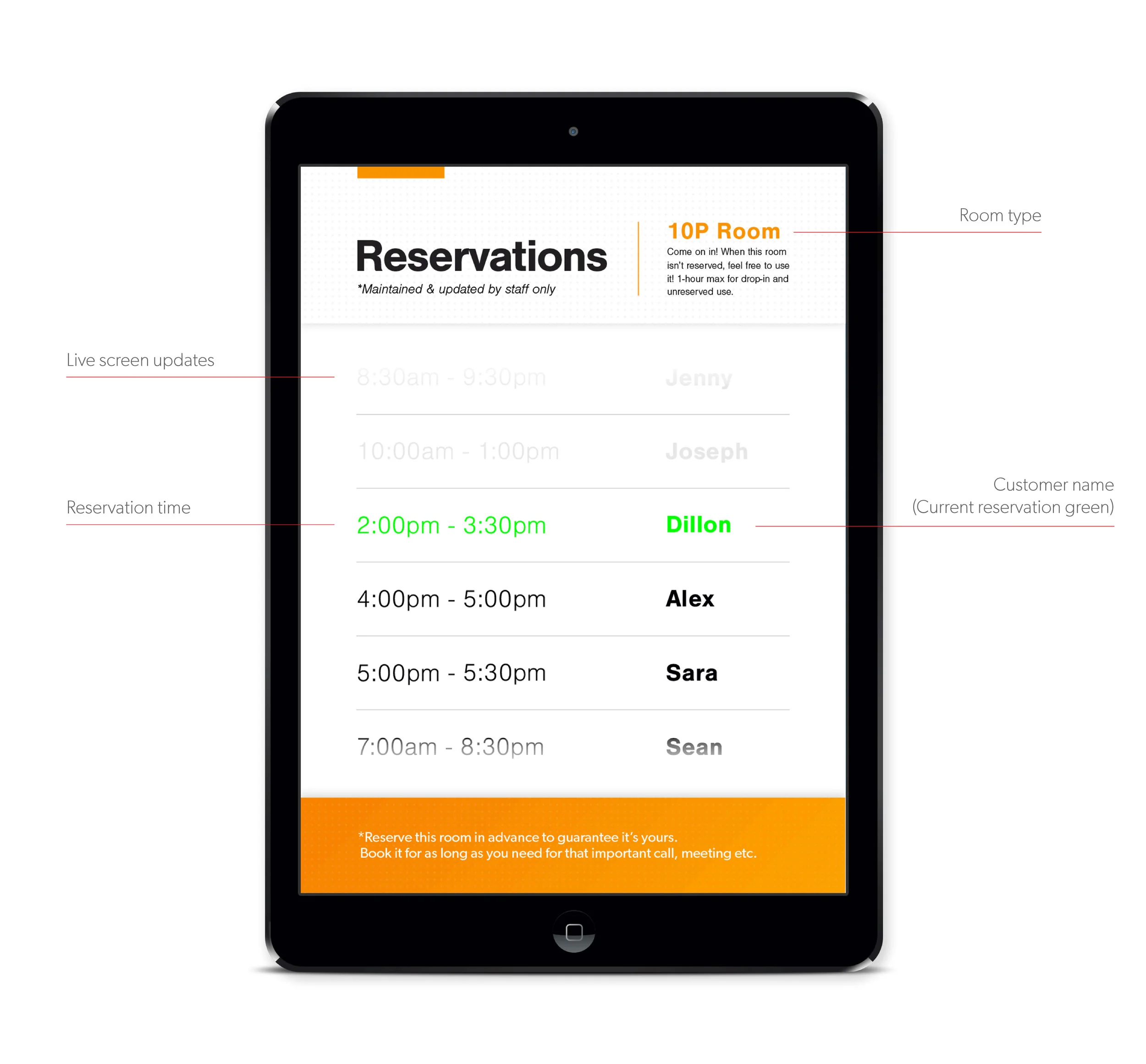 Individual seat lights synced with native app for customer/staff ease of workspace check-in. Developed to accommodate all seating types within workspace.